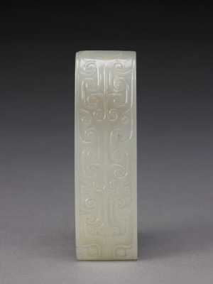 鉴赏鉴定:器为上等白玉制作。略呈长方形,两端弯曲。背面有一仓孔。表面浅浮雕一兽面纹,余为勾连云纹。一般剑璏除此种纹饰外,有的表面高浮雕大、小螭各一。
