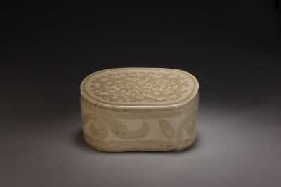 藏品名称:金定窑白釉剔花卷草纹腰圆枕。