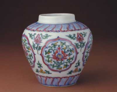藏品名称:明成化斗彩开光折枝莲纹罐。