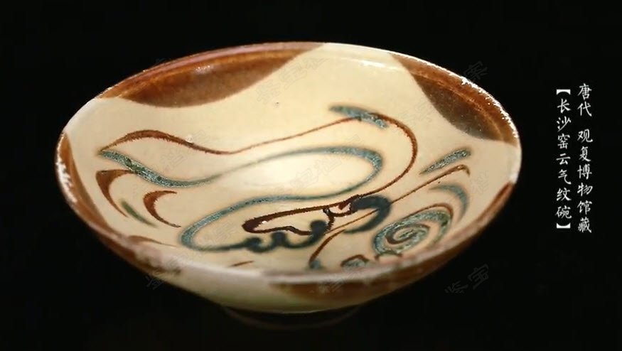这是一件长沙窑云气纹碗,是著名沉船“黑石号”上的碗。黑石号,之前我们讲过。为什么这碗到我手了?不是那一船全卖给新加坡国立博物馆吗?我告诉你,黑石号是渔民先发现的。渔民捞了好多东西走,发现捞不完,最后被德国打捞船知道,才被控制起来。黑石号上有大量的这种碗,你看它画的是云气纹。这就是黑石号上的一件普普通通的碗,釉面保存很好。这个碗上的信息是什么呢?是它已经有了一种大写意的意识。你看他画的这个云气纹,非常写意,几笔就画完,一看就是软笔画的,而且使用了两种颜料,一种绿色一种褐色,非常漂亮。我们看到的这一批碗里有画植物的、有写字的、有云气纹的,每个都不同,每个都非常个性化。