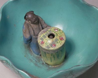 此为宜兴窑作品。杯呈荷叶状,圜底,钉状三足。整器以宜兴紫砂为胎,内外施绿釉,外壁点缀团花。杯内心为一头梳双髻、袒胸露腹、笑容可掬的仙人,面对一施黄彩的圆柱而坐。圆柱中空,内有紫砂陶质细长浮柱,作寿星状,圆柱上围绕浮柱有5个红点。