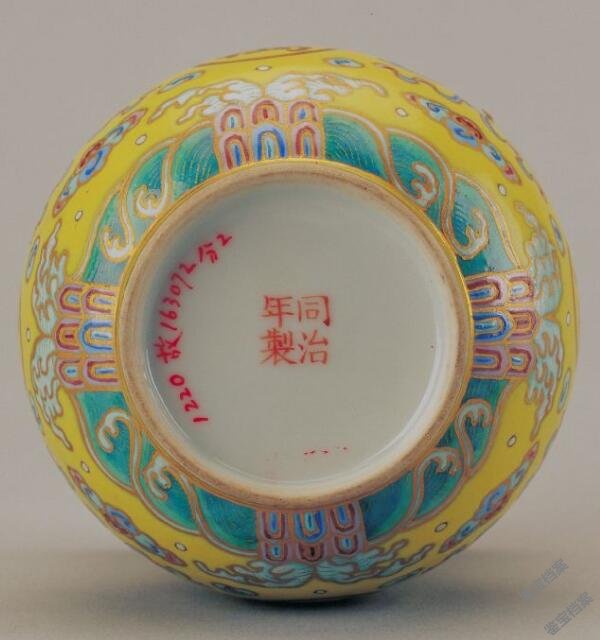清同治黄地粉彩万寿无疆纹奓斗档案