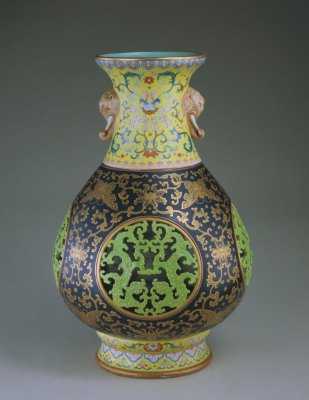 鉴赏鉴定:瓶敞口,束颈,垂腹,圈足。颈部两侧各有一象首为瓶耳。瓶外颈部饰黄地轧道粉彩折枝莲纹,腹部饰霁蓝描金蝴蝶勾莲纹,四面圆形开光内镂雕绿色蟠螭纹,足部饰黄地轧道粉彩云头纹。全器在颈、腹处分为外套和内瓶两部分。瓶颈与内套瓶相连,可以旋转,套瓶白地粉彩绘婴戏社火图。瓶内壁施松石绿釉。底足内施松石绿釉书红彩“大清乾隆年制”篆书款。