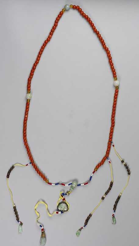 鉴赏鉴定:玛瑙,色泽鲜红。整个朝珠串由108粒玛瑙珠贯穿而成,每隔27粒穿入一粒称为“佛头”的大珠,与垂于胸前正中的一粒佛头相对的则称为「佛头塔」,其下并有坠饰,皆为翠玉。在佛头塔两侧缀有三串小珠,每串小珠十粒,名为记捻。朝珠源自数珠,是清代君臣、后妃、命妇穿著朝服或吉服时,垂挂在胸前象徵身分地位的饰物。