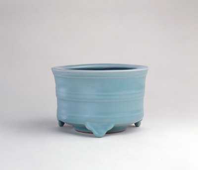 鉴赏鉴定:炉口沿较宽,直壁,圈足,足下承三个云头形足,三足与圈足在同一平面。器身凸起弦纹四道,上下各一道,中间两道。通体施梅子青釉。