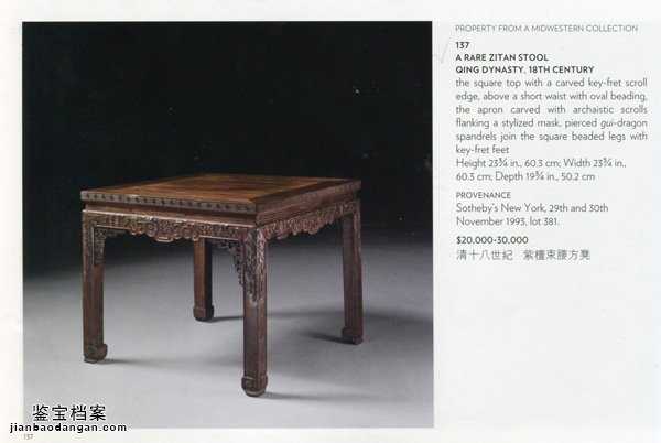 昨天深夜两点半,正是纽约的下午两点半,越洋电话打过来,本该进入梦乡的我,熬鹰似地等待这一刻,这只编号137的紫檀束腰乾隆工的大方凳,从10,000美元起价,最终50,000美元落槌,连佣金62,500美元,整整比二十年前贵了二十倍。一年涨一倍,对我不知是喜还是忧。