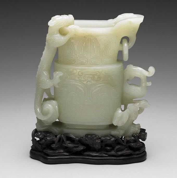鉴赏鉴定:青玉质。器形系仿青铜「觥」之造型,器身雕有兽面纹及蕉叶纹,器流下繫有活环,并雕一龙趴附器身为柄,器旁则浮雕凤一螭一。其中龙柄与上承器身之凤鸟的静态表现,恰与器身扭转多姿的螭龙动静相映成趣。附木座。