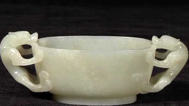藏品1:玉双螭耳杯。这种杯在明末很流行,在当时是实用器,这就是明末的。