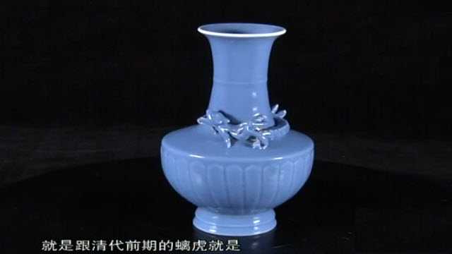 藏品5:蓝釉螭虎莲瓣纹长颈瓶。螭虎不够精神,这是清后期的仿品。折肩比较硬,达不到乾隆时期的水准。