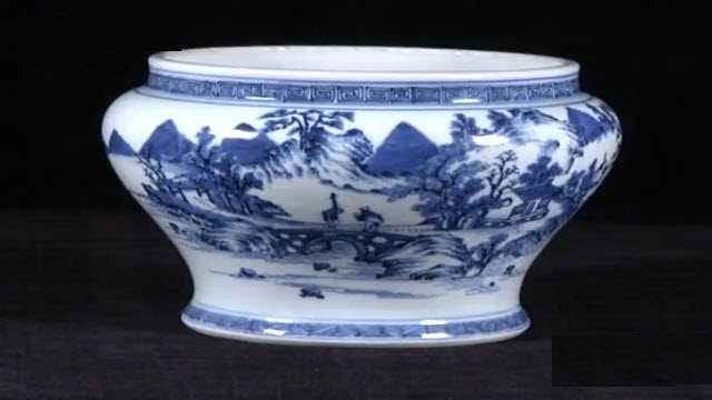 藏品1:青花山水人物纹尊。一般来讲,口大于底的都可以称之为尊,这个造型很少见,介乎于罐子和将军罐之间,从造型和画风来看,是雍正后期到乾隆时期的东西。
