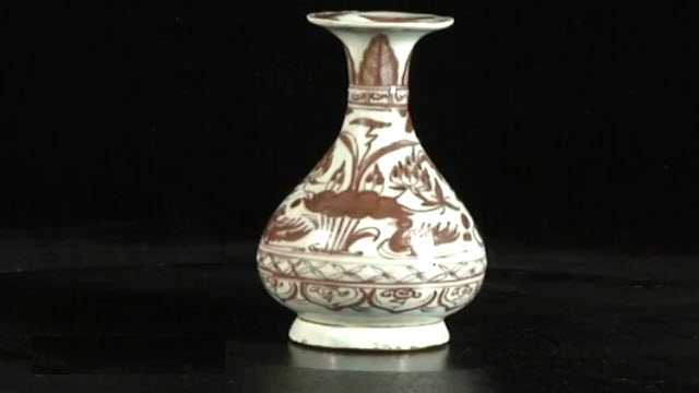 藏品1:釉里红莲池鸳鸯纹玉壶春瓶。莲池鸳鸯是元代的典型画片,一般的玉壶春瓶尺寸都比这个大,元代多用印模工艺,尺寸都差不多,再者这个比较厚,而且多层次的装饰一般都放在大器物上,这是件仿品。