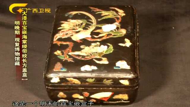 本期主题宝物:明晚期大漆百宝嵌海棠绶带纹长方盖盒。