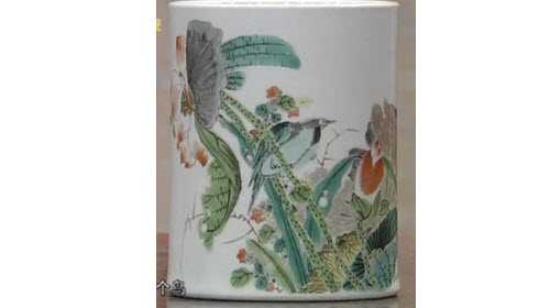 五彩花鸟纹笔筒:看新,底足,仿古,看老,荷塘翠鸟,胎质,笔筒,玉璧底,康熙时期,白浆,残荷败柳,老物件;