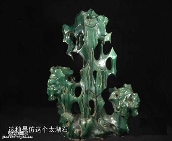 藏品1:绿釉仿生太湖石。仿生瓷在乾隆年间尤为流行,分装饰类和造型类,太湖石的特点是瘦皱漏透,这个仿的都具备这些特点,这是新中国成立之前的,算是老的。