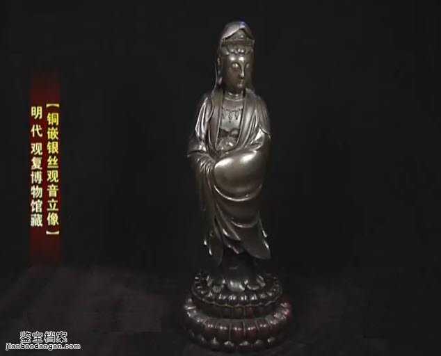 藏品3:铜嵌银丝观音立像。用坚硬表现柔软,雕塑的手是揣起来的,丝绸衣褶显得十分柔软。