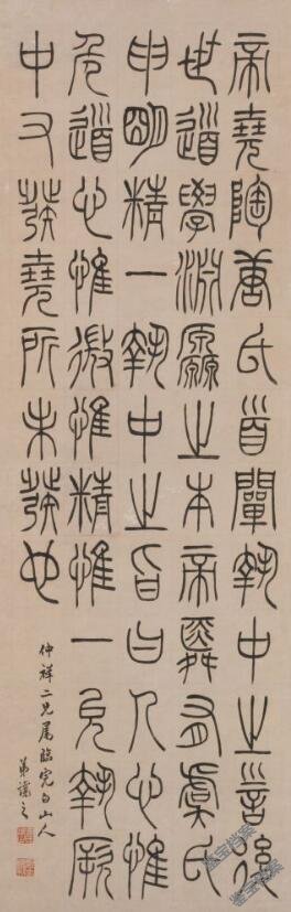 吴熙载篆书传邓石如衣钵,但行笔的开合、间架的布置都别有情致,形成自己的风格。此轴自称临完白山人,结体严整,屈曲盘回,意态澹雅清新,具文人士气。