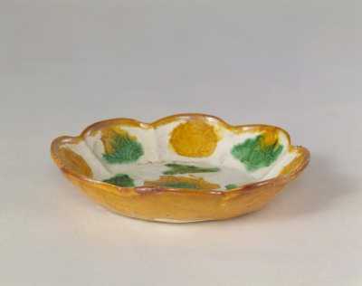 鉴赏鉴定:盘敞口,口沿为8瓣花口,斜壁,平底。盘内壁模印8朵花卉,中心模印一硕大的花朵,外饰4片茨菇叶。花纹外以水波纹作地。盘内施黄、绿、白三种色釉,其中白釉为地,花叶纹则以黄、绿色釉间隔排列,盘外施黄釉。