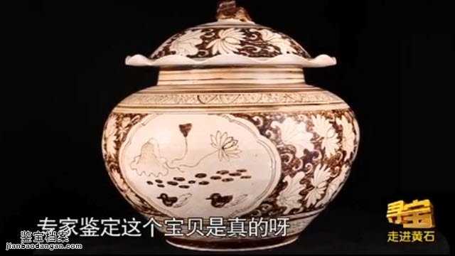 吉州窑褐彩开光鸳鸯荷莲盖罐。