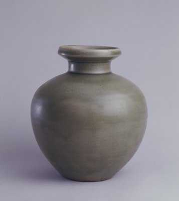 耀州窑瓷器中瓶式很多,瓶体或修长秀丽,或丰满端庄,但像此件石榴式样的瓶却较少见,应为北宋早期产品。这时期耀州青瓷釉面皆玻璃质感强,施釉均匀,大多开有细碎片纹,胎釉结合紧密,没有剥釉现象。品种以日用瓷为主,造型方面与五代耀州窑瓷器有明显的继承关系。