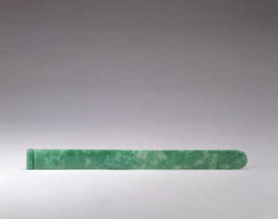鉴赏鉴定:扁方翠质,体细长,一端呈舌形,一端反卷并将其两头雕作梅花式。整体光素,略有白斑,但不掩其翠色深碧艳丽之美。