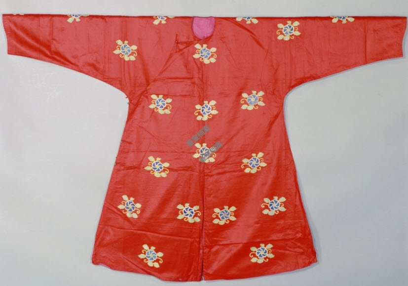 驾衣圆领,大襟右衽,马蹄袖,裾前后开。大红色绫面,内衬粉色平纹布里,缀铜鎏金錾花扣五。