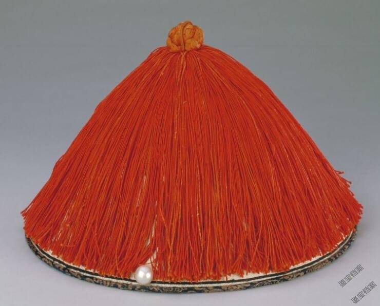 冠式如斗笠,以本色丝织席纹纱为面,冠缘沿石青色花卉纹织金缎边及石青色丝织人字绦,帽前缀大东珠一粒。上饰大红色丝线盘花冠顶,即所谓“红绒结顶”,四周垂洒红丝拈线。冠内衬大红色绉绸里,内钉同质软帽圈,垂蓝布抽拉系带。