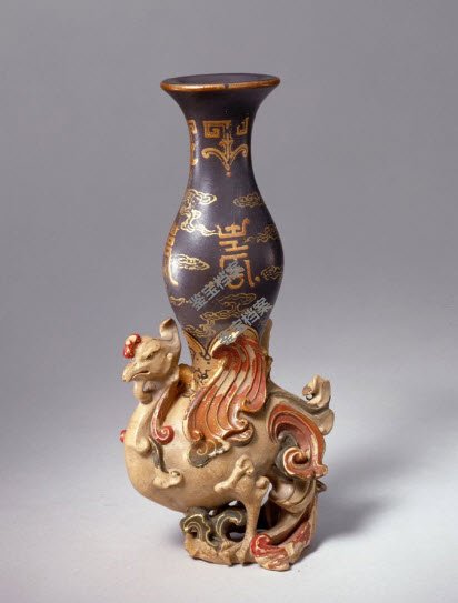 尊作天鸡驮宝瓶式,天鸡腹中空,与宝瓶的底部相通,鸡首口部有出气孔。通体以白、绿两色砂泥制成,以金彩描绘花纹。天鸡立于祥云之上,背托宝瓶,翅膀、鸡冠等部位施红彩。宝瓶上绘金彩祥云及“寿”字纹。